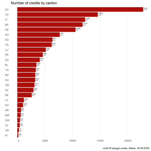 The following charts illustrate distributions of Covid-19 bridging credits for a selected specification, for example by canton or by industry. These visualizations serve to provide background information and are based on data from the guarantee organizations. In order to exclude any conclusions about individual companies and to guarantee their anonymity, only aggregated data can be made available. Due to rounding, it is possible that the sum of the shares may not be 100%.