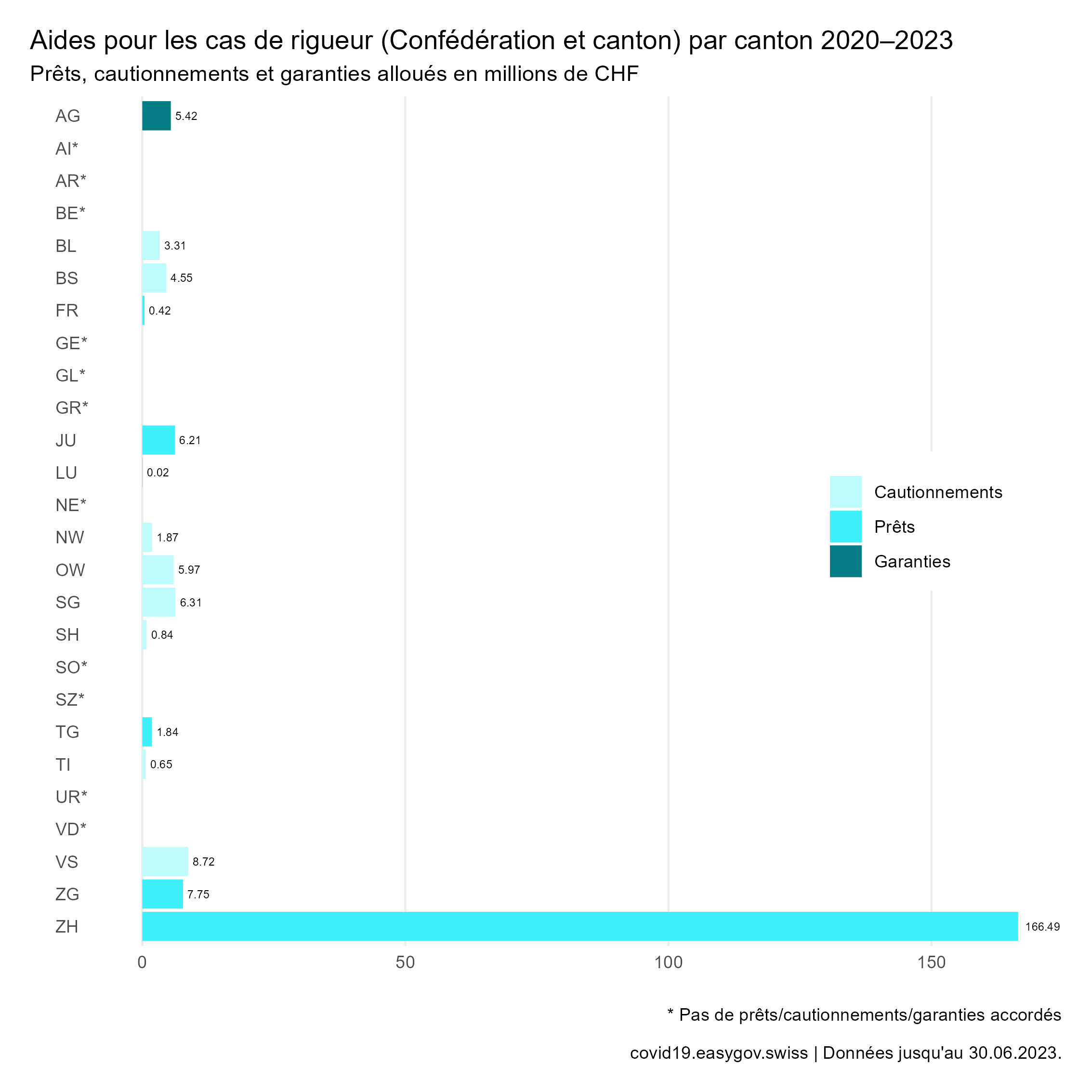 Les graphiques suivants illustrent l’utilisation des aides pour les cas de rigueur COVID-19 pour les entreprises. Ces visualisations sont basées sur les données des cantons. Les chiffres sont mis à jour semestriellement. Ils peuvent donc différer des chiffres quotidiens. Afin de ne pas tirer de conclusions sur des entreprises individuelles et de garantir leur anonymat, seules des données agrégées peuvent être mises à disposition. En raison de l’arrondissement, il est possible que la somme des parts ne soit pas de 100 %.