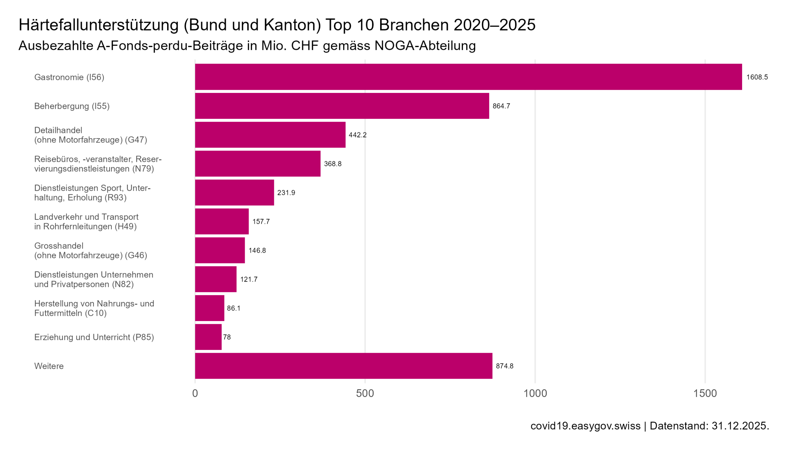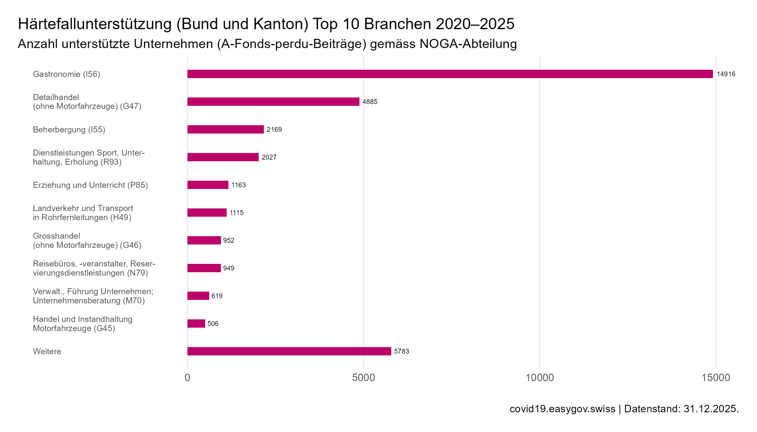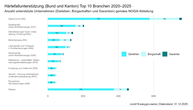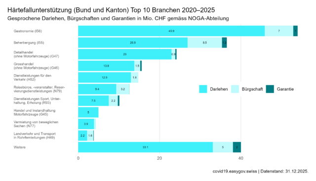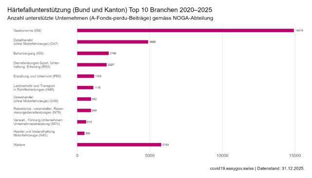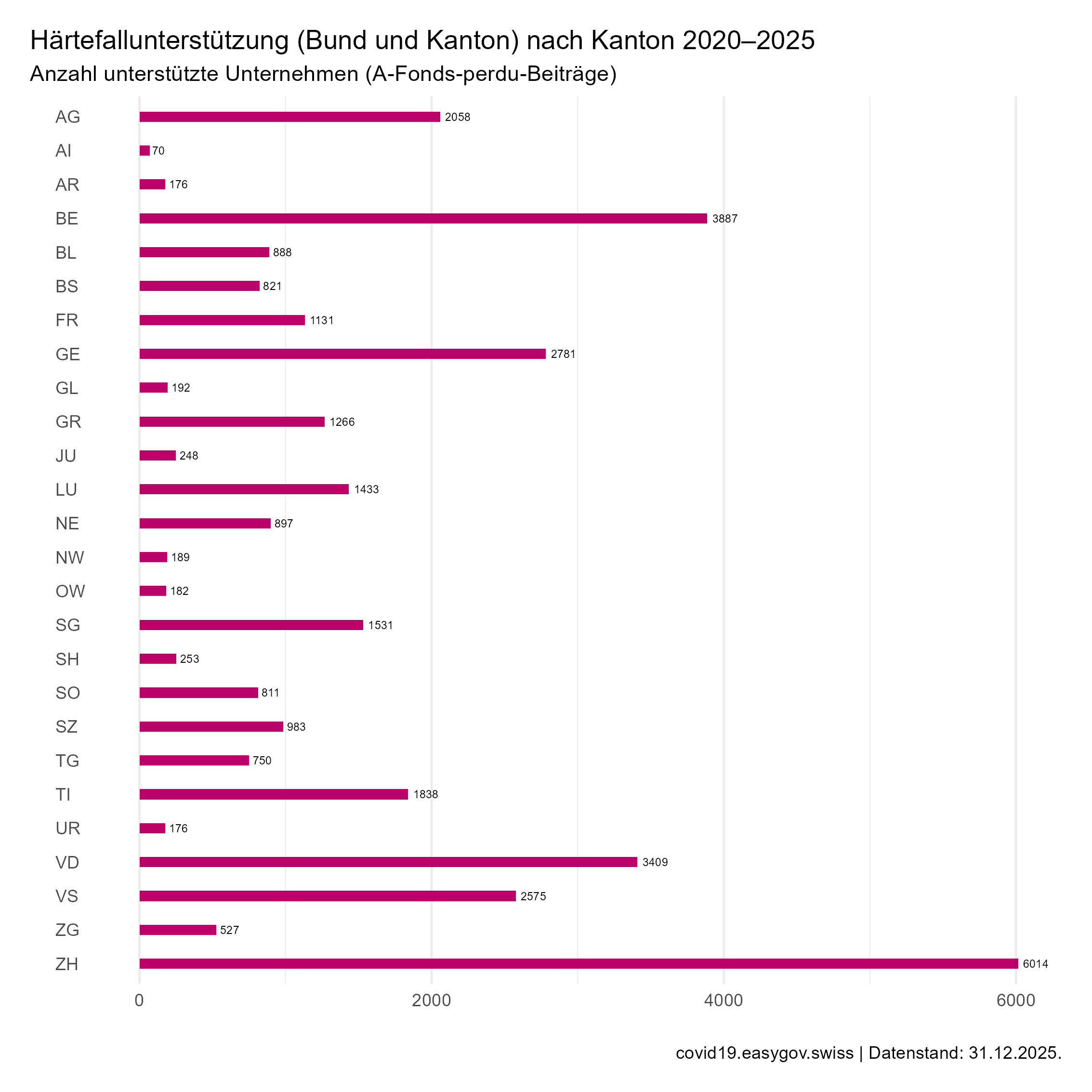 Im Rahmen des Covid-19-Härtefallprogramms haben 35’226 Unternehmen insgeamt mehr als 5,2 Milliarden Franken Unterstützung erhalten (Stand: 31.12.2024). Dies in Form von nicht rückzahlbaren Beiträgen (ca. 96 % des Gesamtbetrags der gezahlten Hilfen) oder in Form von Darlehen, Bürgschaften oder Garantien.