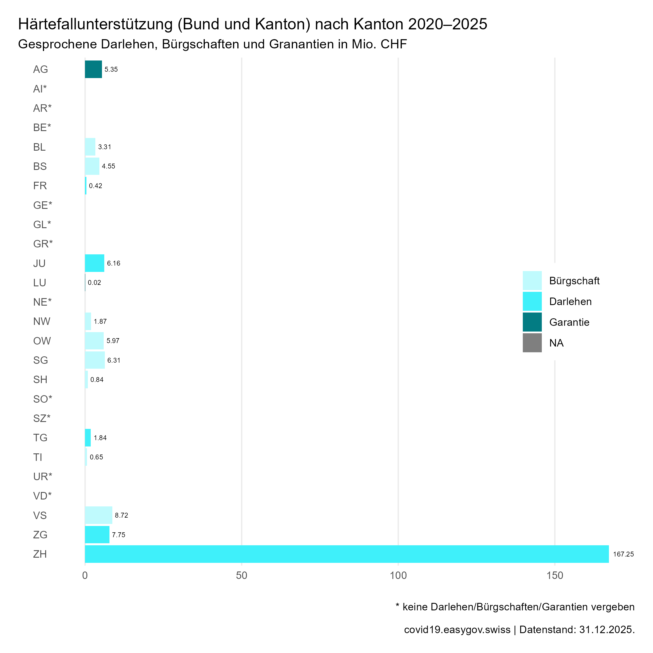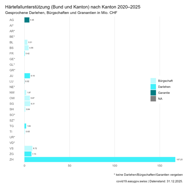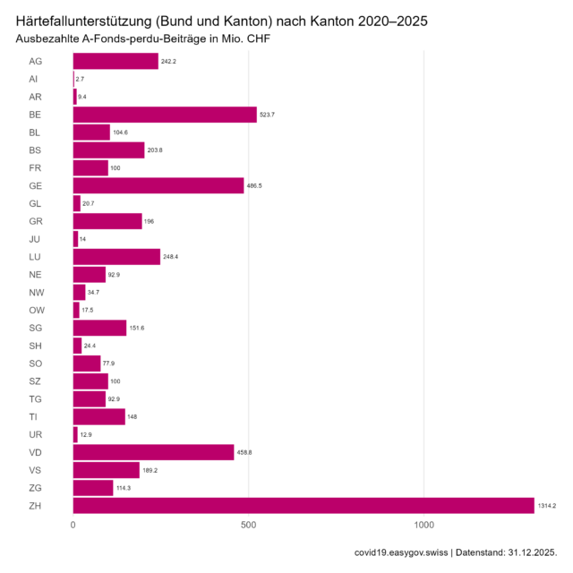 | Von den Kantonen zwischen dem 01.03.2020 und dem 31.12.2025 ausbezahlte bzw. gesprochene Härtefallunterstützungen |