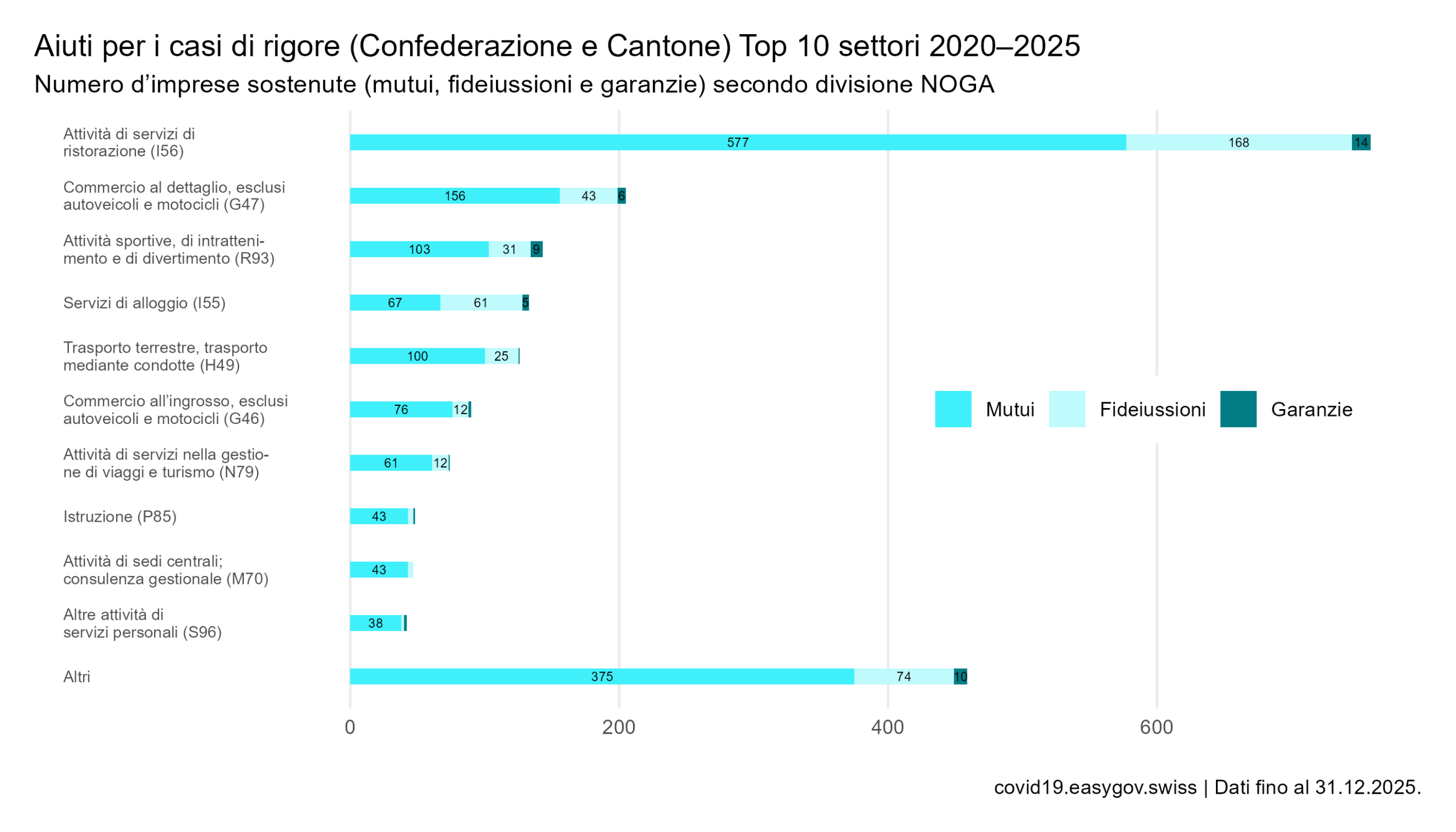 Nell’ambito del programma di sostegno per i casi di rigore COVID-19, 35’226 imprese hanno ricevuto più di 5,2 miliardi di franchi di sostegno (stato al 31.12.2024) sotto forma di contributi a fondo perduto (circa il 96% dell’importo totale degli aiuti versati) o sotto forma di prestiti, fideiussioni o garanzie.